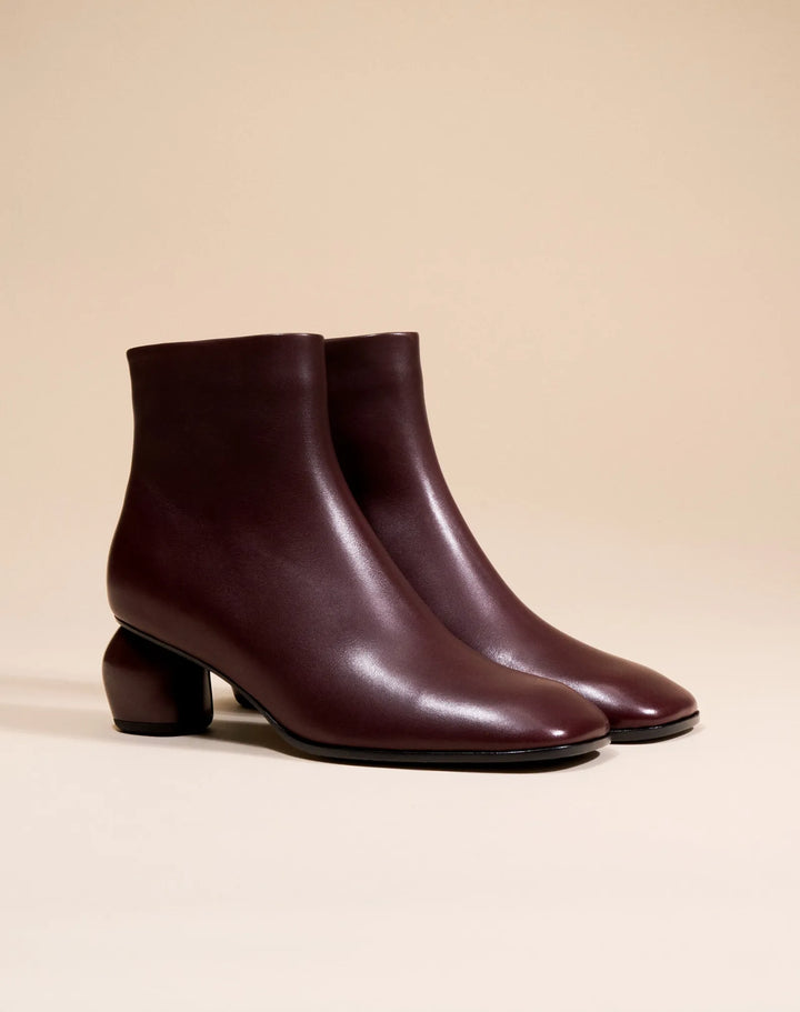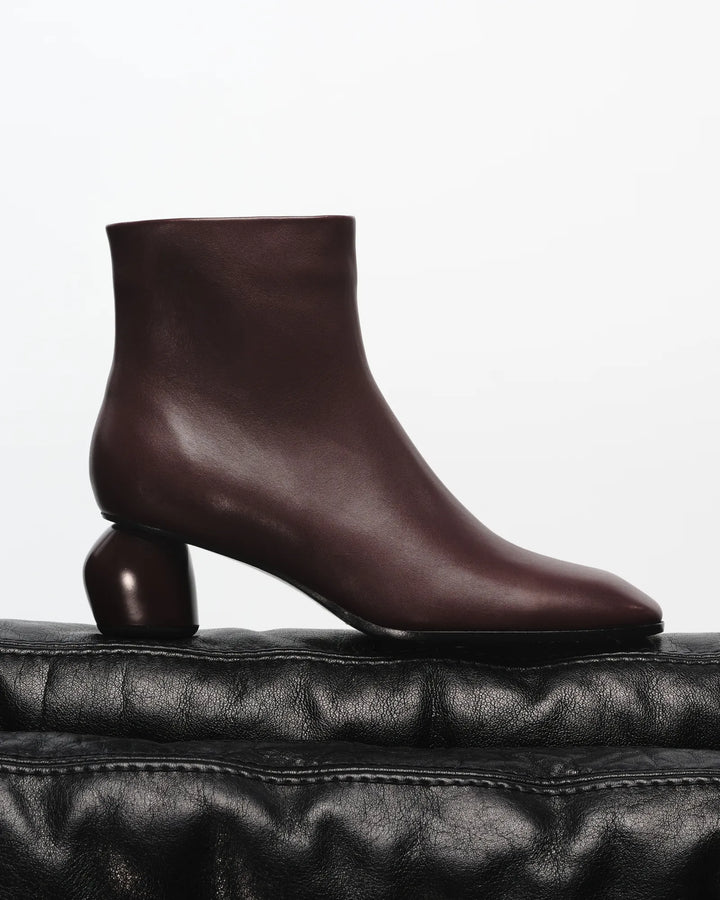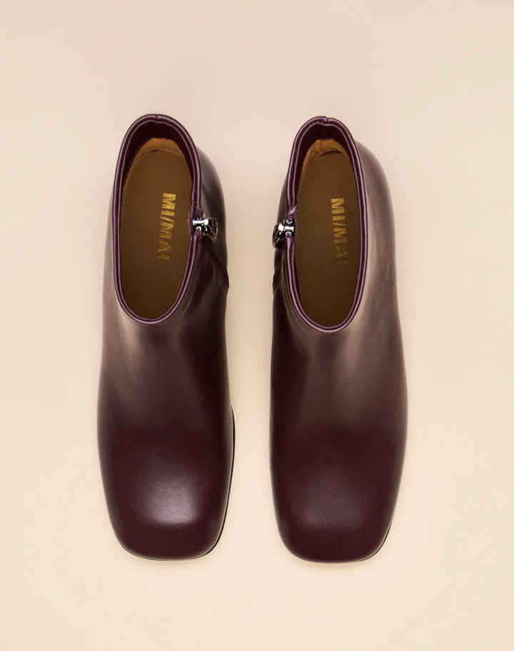 La bottine Mimai Tadao Burgundy revisite le classique bottillon bordeaux avec une touche architecturale. Son bout carré moderne et son talon bas 5 cm sculptural apportent une allure graphique et confortable à chaque pas.
