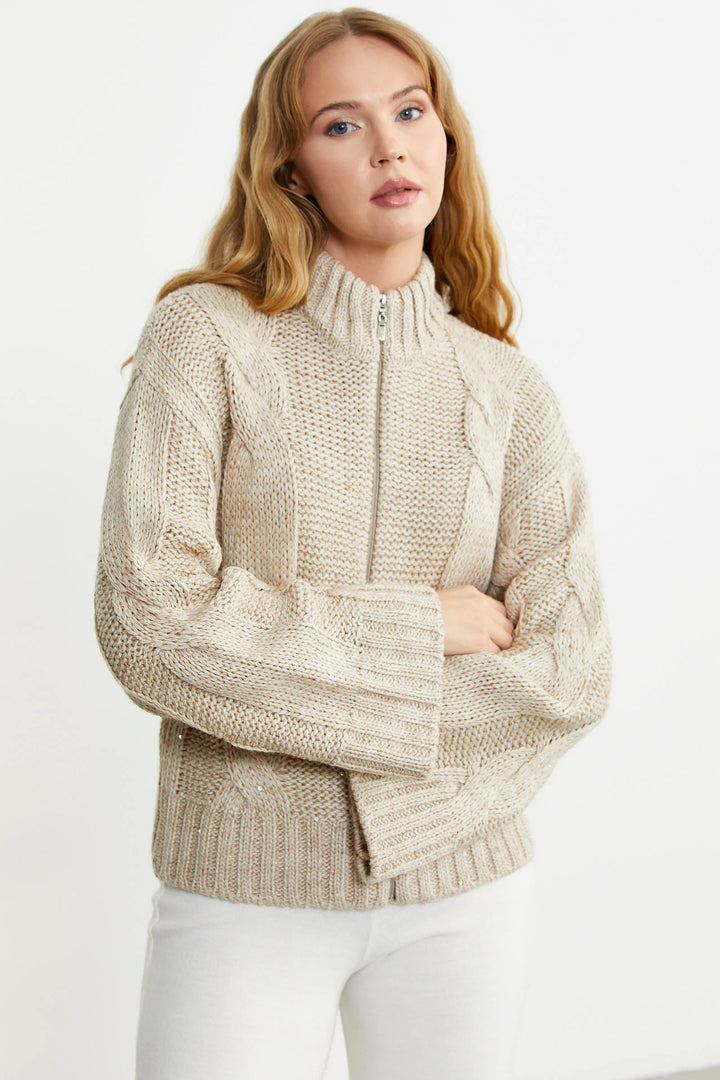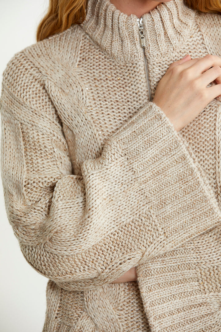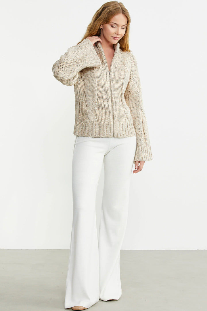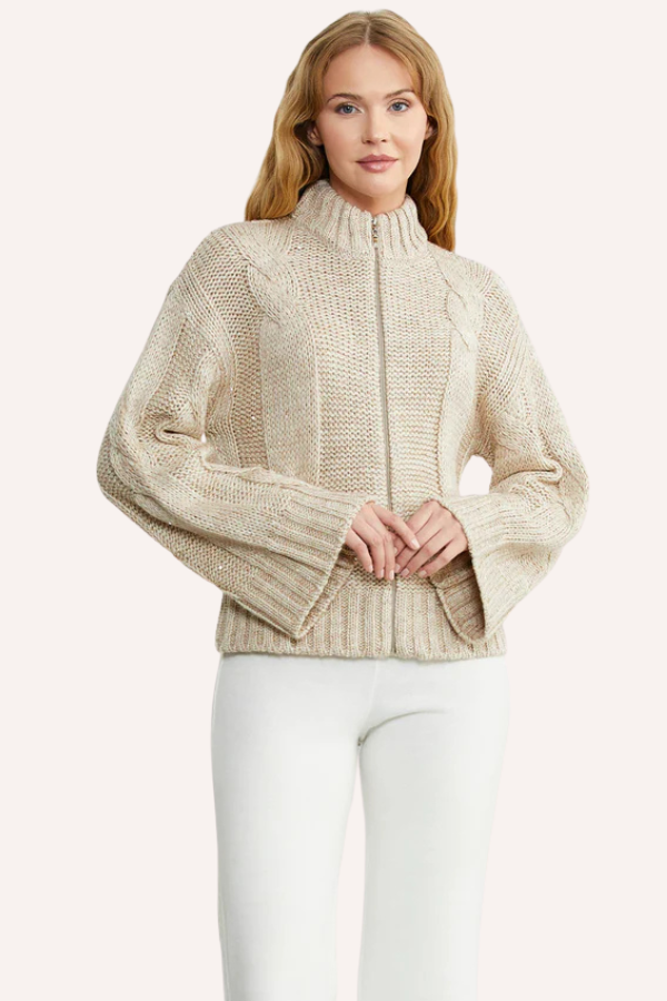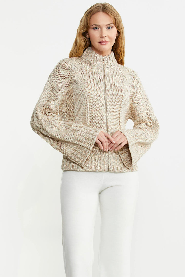 La maille s’illumine avec ce cardigan doux et raffiné, orné de discrets fils dorés pour une touche d’éclat subtile. Confectionné dans un mélange de laine et d’acrylique, il allie chaleur et légèreté pour un confort absolu.