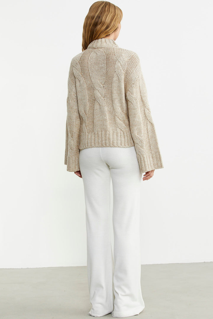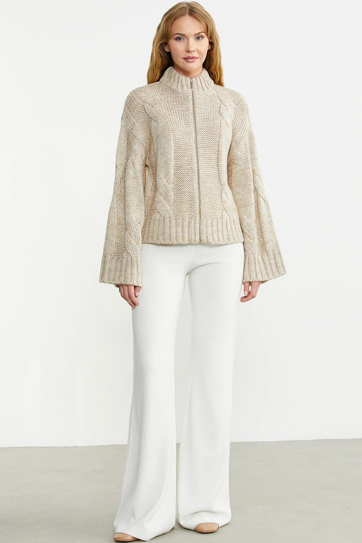 Sa coupe ample, ses manches longues évasées et son col montant zippé lui donnent un style moderne et décontracté, parfait à superposer sur un pantalon droit ou une jupe midi.
