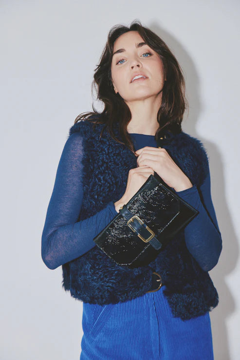 Réalisée en cuir de vachette vernis Crispy Noir, elle séduit par son éclat subtil et ses finitions soignées.