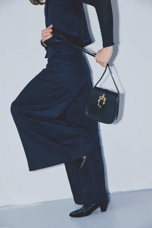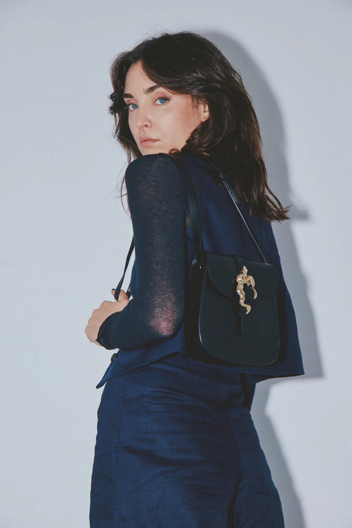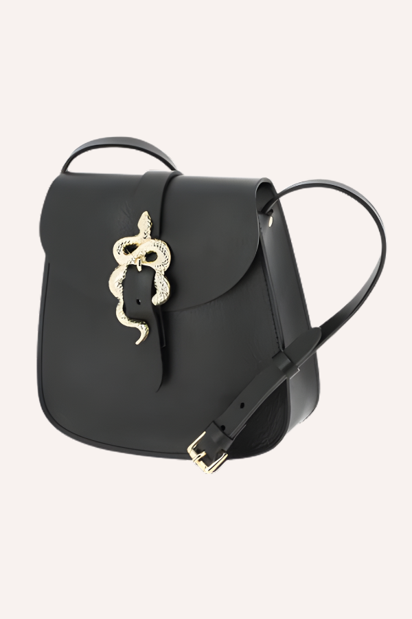 Son rabat orné d’une boucle serpent en zamak doré apporte une touche audacieuse et raffinée, symbole de la signature artistique de la marque.