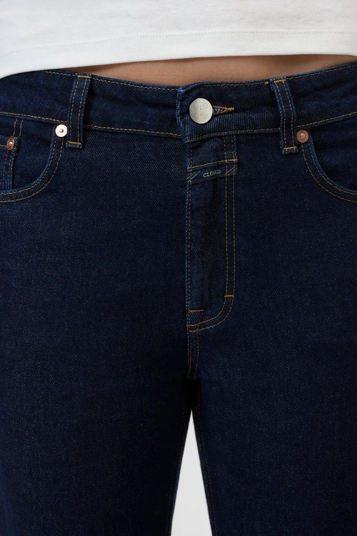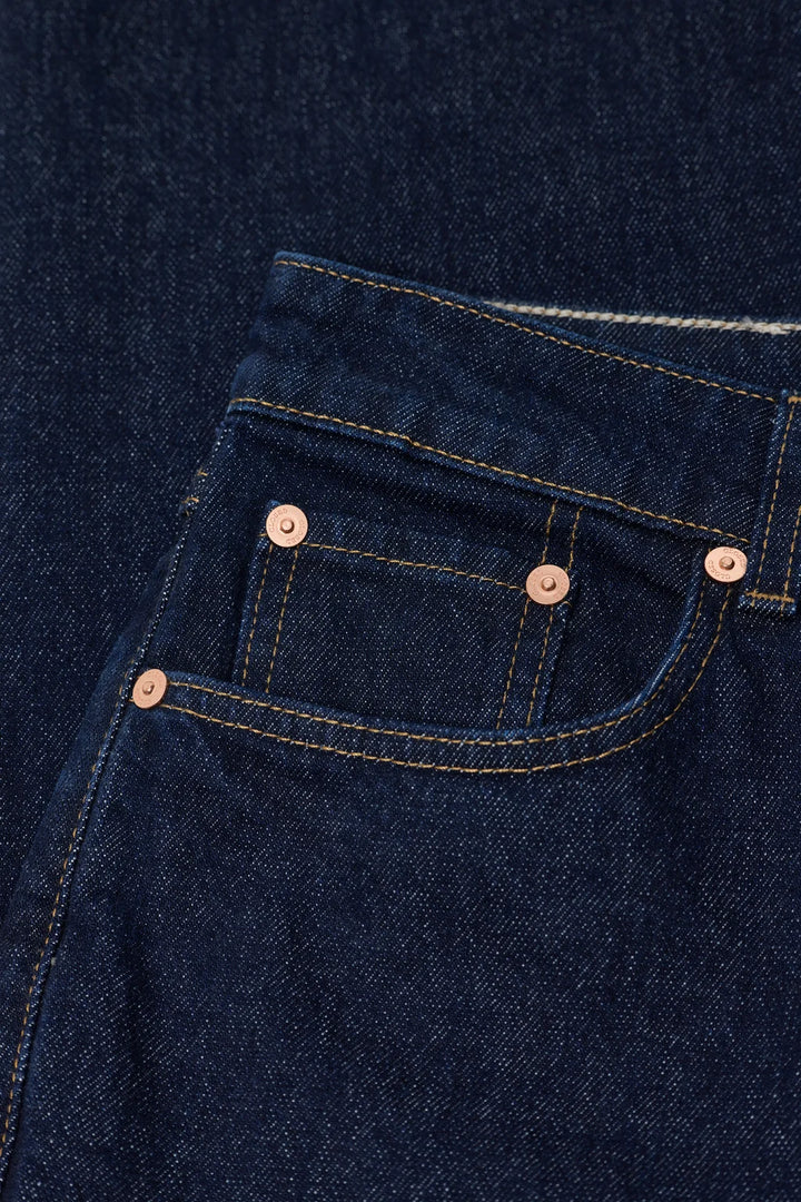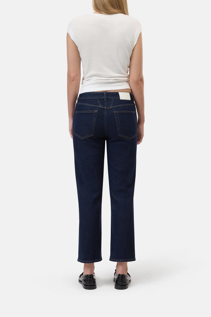 Découvrez Milo, notre jean iconique à la coupe droite et à la taille mi-haute, conçu pour allier allure moderne et confort absolu. Son délavage bleu-noir uniforme, à l’aspect brut, lui confère une élégance intemporelle, rehaussée de surpiqûres couleur tabac et de détails en métal cuivré.