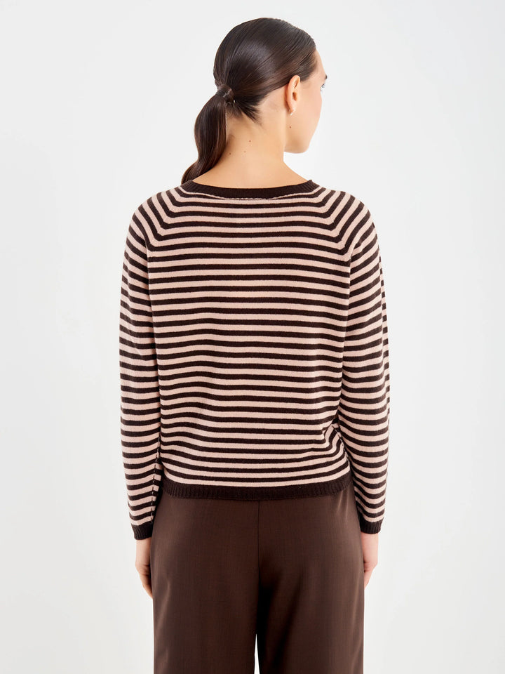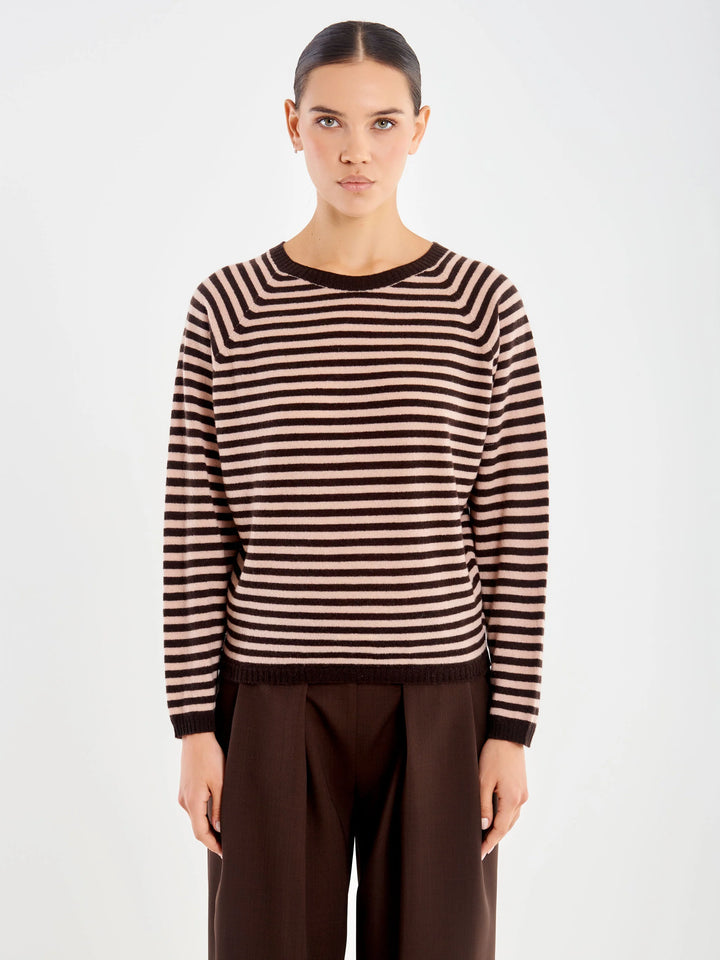 Ce pull à rayures séduit par son élégance intemporelle et son confort exceptionnel. Confectionné dans un mélange luxueux de laine et de cachemire, il offre une douceur incomparable et une chaleur idéale pour la mi-saison ou l’hiver. Son col rond et ses finitions en bord-côte contrasté apportent une touche moderne et raffinée à cette pièce du vestiaire parisien.
