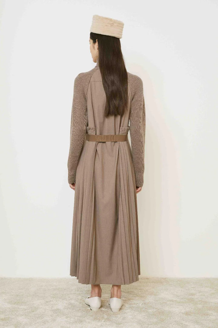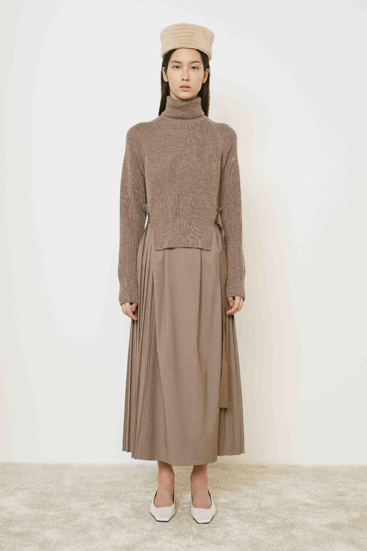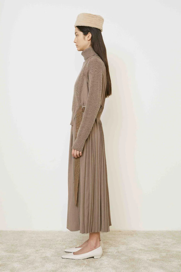 Cette robe longue à la silhouette fluide marie deux textures pour une allure élégante et contemporaine. Le haut en maille côtelée apporte confort et chaleur, tandis que la jupe plissée en tissu léger structure la silhouette avec douceur et mouvement.